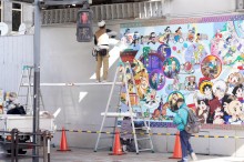 高田馬場駅前のJR山手線、西武新宿線のガード下にある「アトムの壁画」が3月2日に擁壁点検のために一時撤去され、3日に貼り替えが行われた。