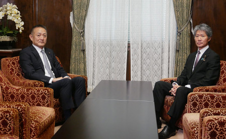 参院国対委員長会談に臨む自民党の磯崎仁彦氏(右)と立憲民主党の斎藤嘉隆氏。党首討論を月内に開催する方向で合意した。26日を軸に調整=7日、国会内 【時事通信社】