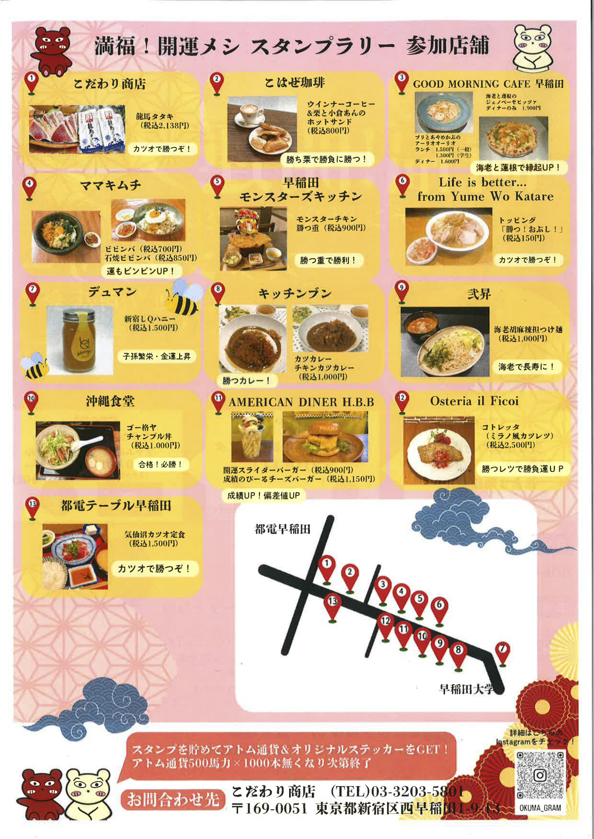 早稲田大学早稲田キャンパス近くの「大隈通り商店会」が「満福!開運メシ スタンプラリー」を現在、開催している。