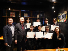 表彰された早大生とW商連のメンバー=早大と周辺の商店街組織「W商連」が懇親会