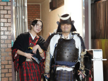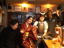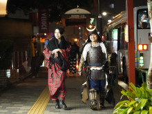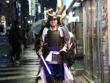 毎年、戦国武将の甲冑(かっちゅう)を身につける金澤さんは、狩猟免許(第一種銃猟、わな猟)を所持している。今年は、甲冑の上に自身が狩猟で仕留めたというクマの毛皮をまとい、街を練り歩いた。今年は新たに目白の「Art Bar TEMKARACO」(豊島区目白3)店主の櫻井らむさんが町娘姿で合流。目白まで足を伸ばして、櫻井さんと親交のある飲食店も巡った。スターウォーズをイメージしたキャラクターを装った男性は「ライトセイバースタイル」(京都府)の販売するライトセイバーを持ち同行した。