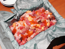メニューは、その日入った海鮮をぶつ切りで提供する「漁港直送!魚群盛り」(2人前1,580円~)、新鮮なアジが入荷した時のみ提供する「漁師の肉厚アジフライ」(1,080円)、中トロや筋子など常時10種類を用意する「押し寿司(ずし)」(980円)、タイを丸ごと使った「漁師の小鯛(だい)酒蒸し」(1,480円)などが一押しという。