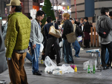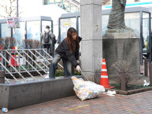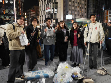 早大の卒業式の夜に清掃活動を行った「ロータリーの会」のメンバー=新宿区と早大「ロータリーの会」が覚書締結