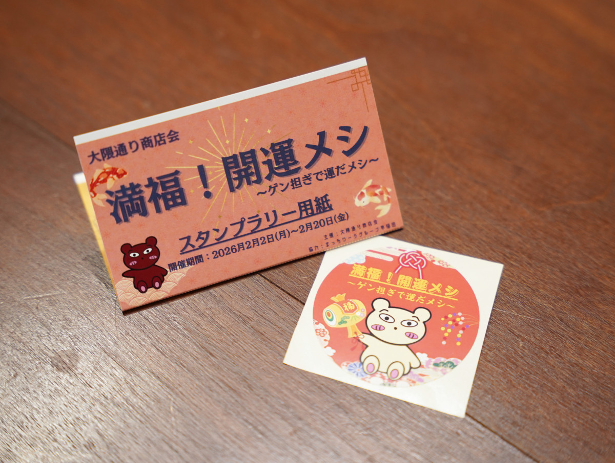 スタンプカードとステッカー=大隈通り商店会が「満福!開運メシ スタンプラリー」
