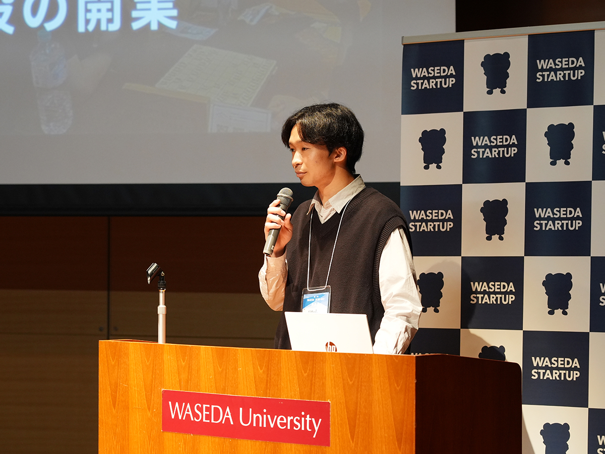 優秀賞の体験型宿泊専用プラットフォーム「ロカンス」の関上雄大さん=早大でピッチイベントの「WASEDA DEMO-DAY」