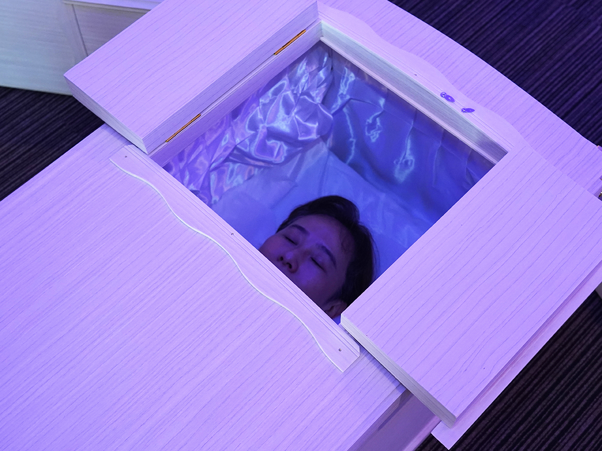 高田馬場駅前に瞑想(めいそう)スタジオ「瞑想空間 かんおけin」(新宿区高田馬場1)が10月1日、オープンした。
