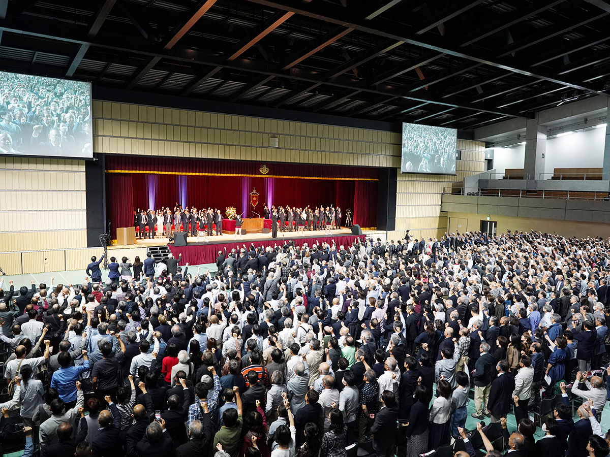 セレモニーでの校歌斉唱の様子=早稲田大学で卒業生の祭典「稲門祭」