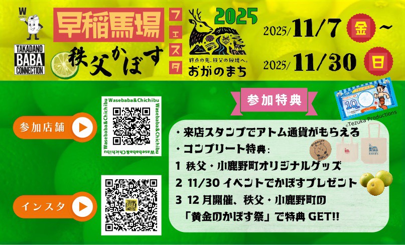 「高田馬場&早稲田 de 秩父かぼす祭」が高田馬場、早稲田エリアの飲食店41店舗で現在、行われている。