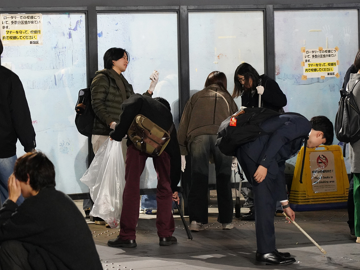 夜の清掃活動の様子 その5=早大サークル「ロータリーの会」が駅前広場を24時間密着