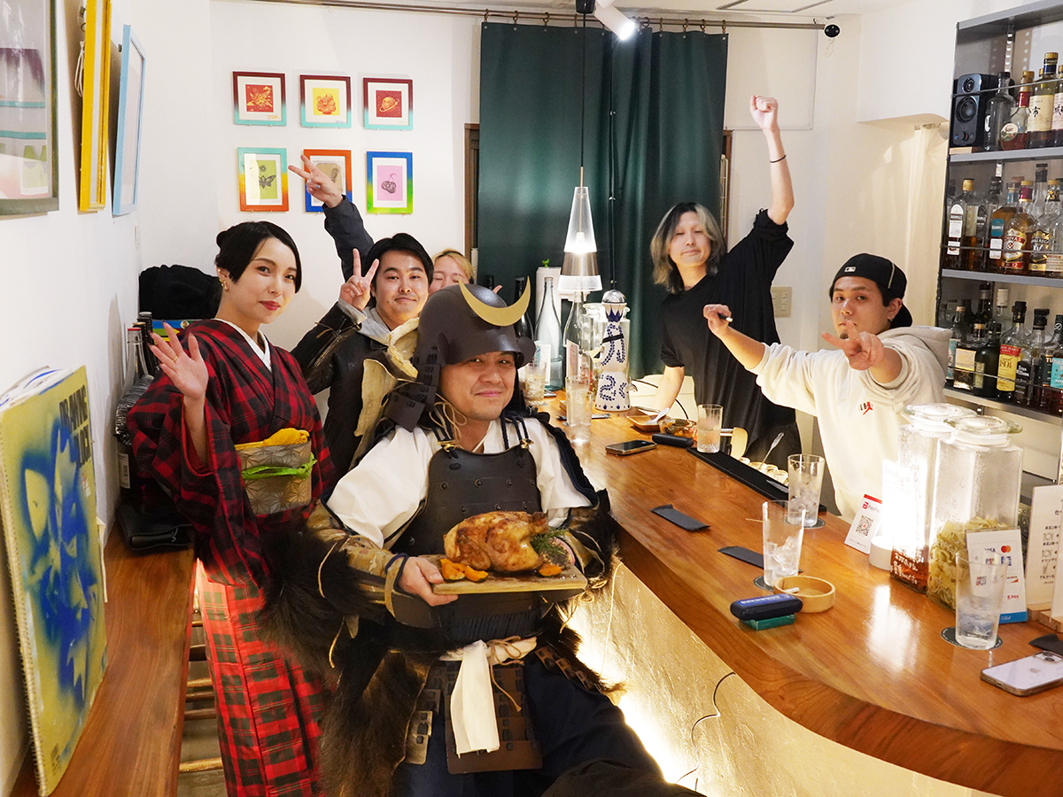 飲食店での記念撮影の様子 その6=高田馬場イブ恒例の武人姿の年末あいさつ回り