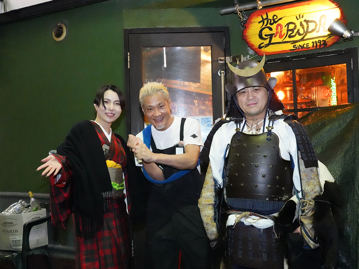 飲食店での記念撮影の様子 その6=高田馬場イブ恒例の武人姿の年末あいさつ回り