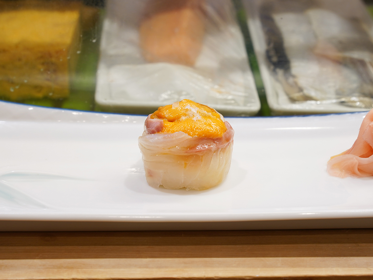 エゾバフンウニと熟成鯛=タイトルは「寿司一貫」、西早稲田の「八幡鮨」4代目が90年の記憶を本に