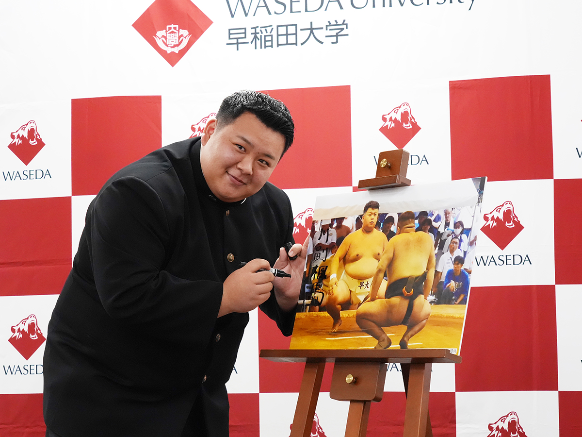 サインをする川副さん=早大相撲部の川副楓馬さんが安治川部屋に入門