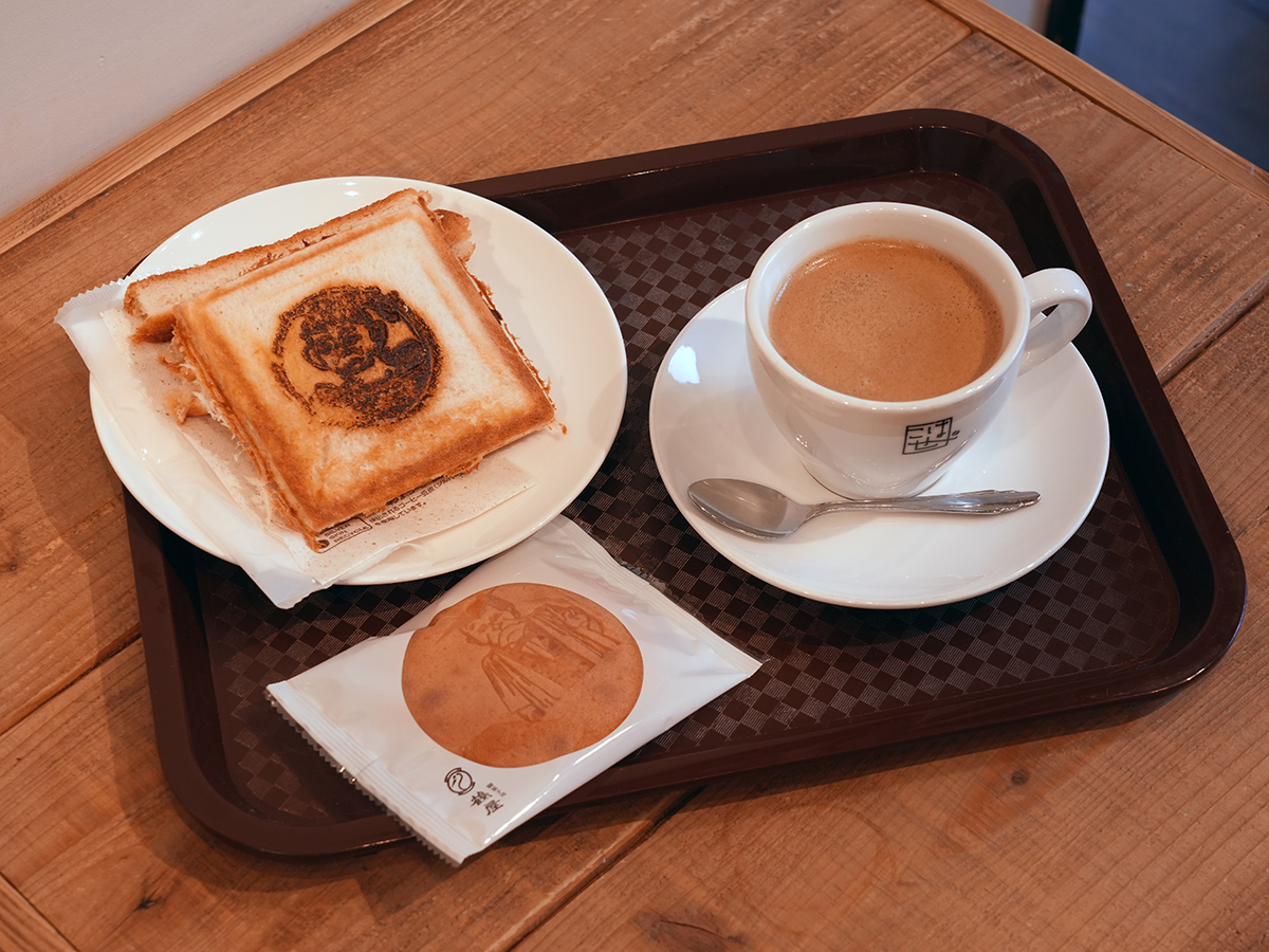 「こはぜ珈琲 早稲田店」で提供。大隈重信の焼き印が付いたホットサンド、コーヒーのセット。鶴屋のまるぼうろも付く。650円