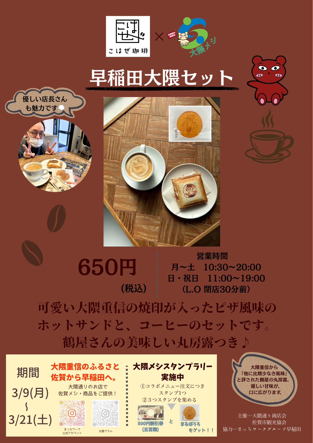 早稲田大学早稲田キャンパス近くにある「大隈通り商店会」(新宿区西早稲田1)で3月9日、「『大隈重信のふるさと 佐賀から早稲田へ』大隈メシスタンプラリー」が始まった。