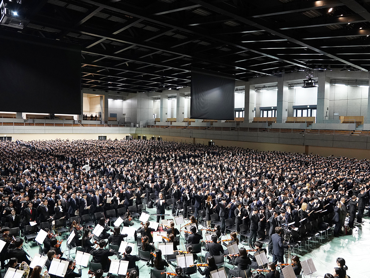 早稲田大学が学部、芸術学校、大学院の入学式を4月1日・2日、「早稲田アリーナ」(新宿区戸山1)で行った。