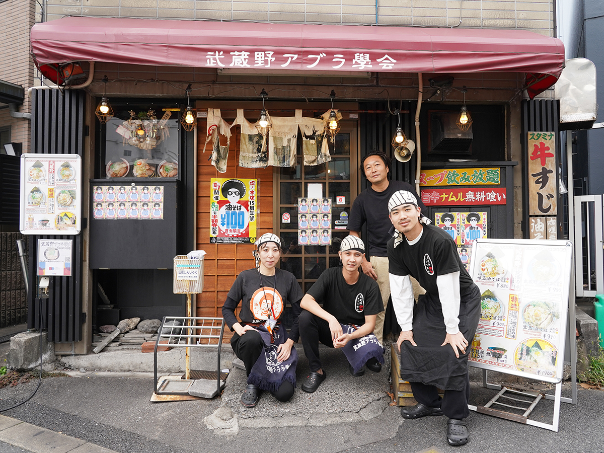 15周年祭で店を切り盛りした大里潤子店長(左)とスタッフ(真ん中、右)=早大近くの油そば専門店「武蔵野アブラ學会」が15周年